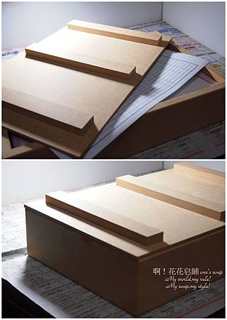 9.盒蓋倒過來放,木條朝外(上圖2)然後整個切線模含木盒「緩慢的倒扣」